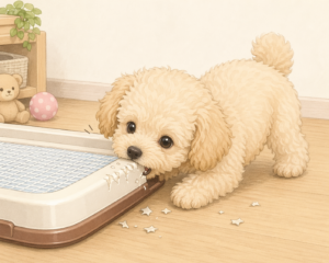 子犬がトイレを破壊する。床置きのトレータイプのトイレはプラスチックでできている。それをかじったり、その網目にはさみ込んであるペットシーツをかじって出したり、こういった行動は、飼い主にとってはトイレがうまくできていないと受 […]